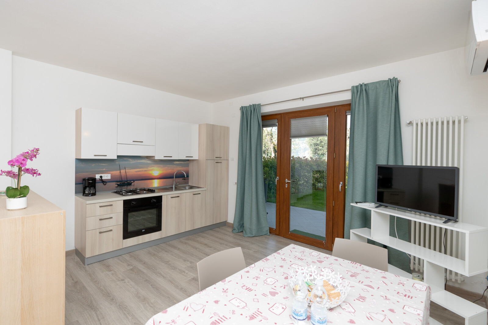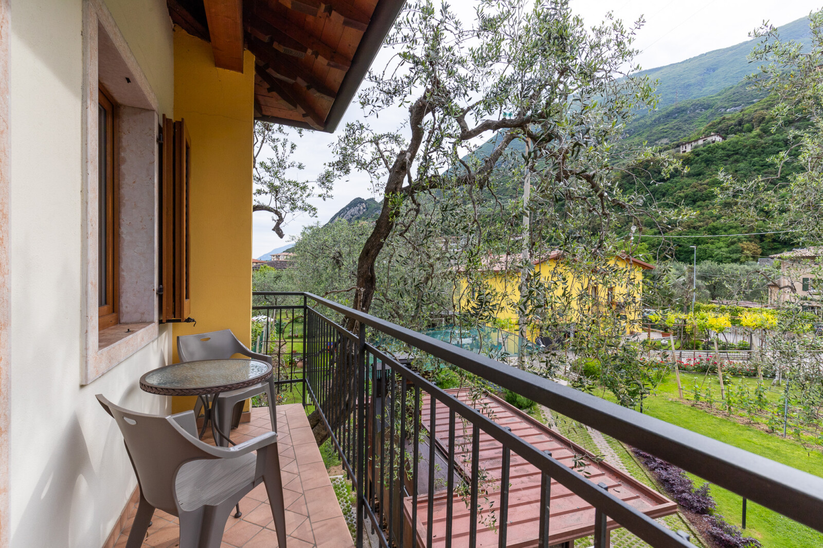 Ha vista sul Baldo, balcone e si affaccia su un fresco giardino in cui trovi un tavolino con le sedie per fare colazione la mattina, o pranzare al fresco o cenare all’ombra dell’ultimo sole.