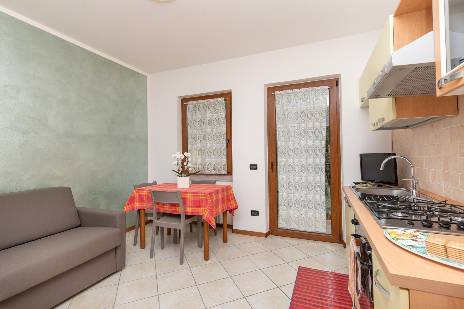Il monolocale è luminoso, arredato con mobili semplici, la zona giorno attrezzata con angolo cottura, pensili, elettrodomestici, tavolo e sedie per far sì che il tuo soggiorno sia comodo e facile.