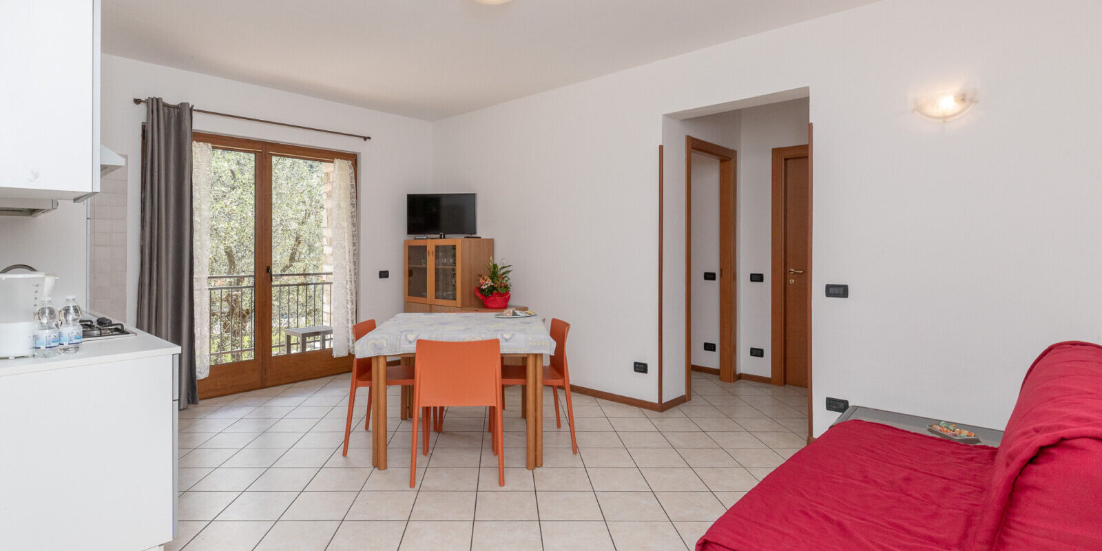 Nella zona giorno, oltre al blocco cucina attrezzato, al tavolo con sedie c’è anche un allegro divano rosso, che può diventare anche un posto letto.