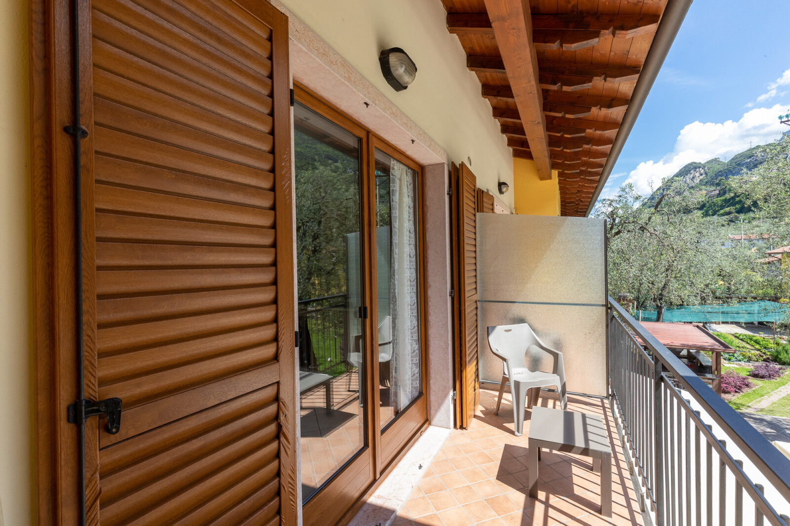 Ha vista sul Baldo, balcone e si affaccia su un fresco giardino in cui trovi un tavolino con le sedie per fare colazione la mattina, o pranzare al fresco o cenare all’ombra dell’ultimo sole.