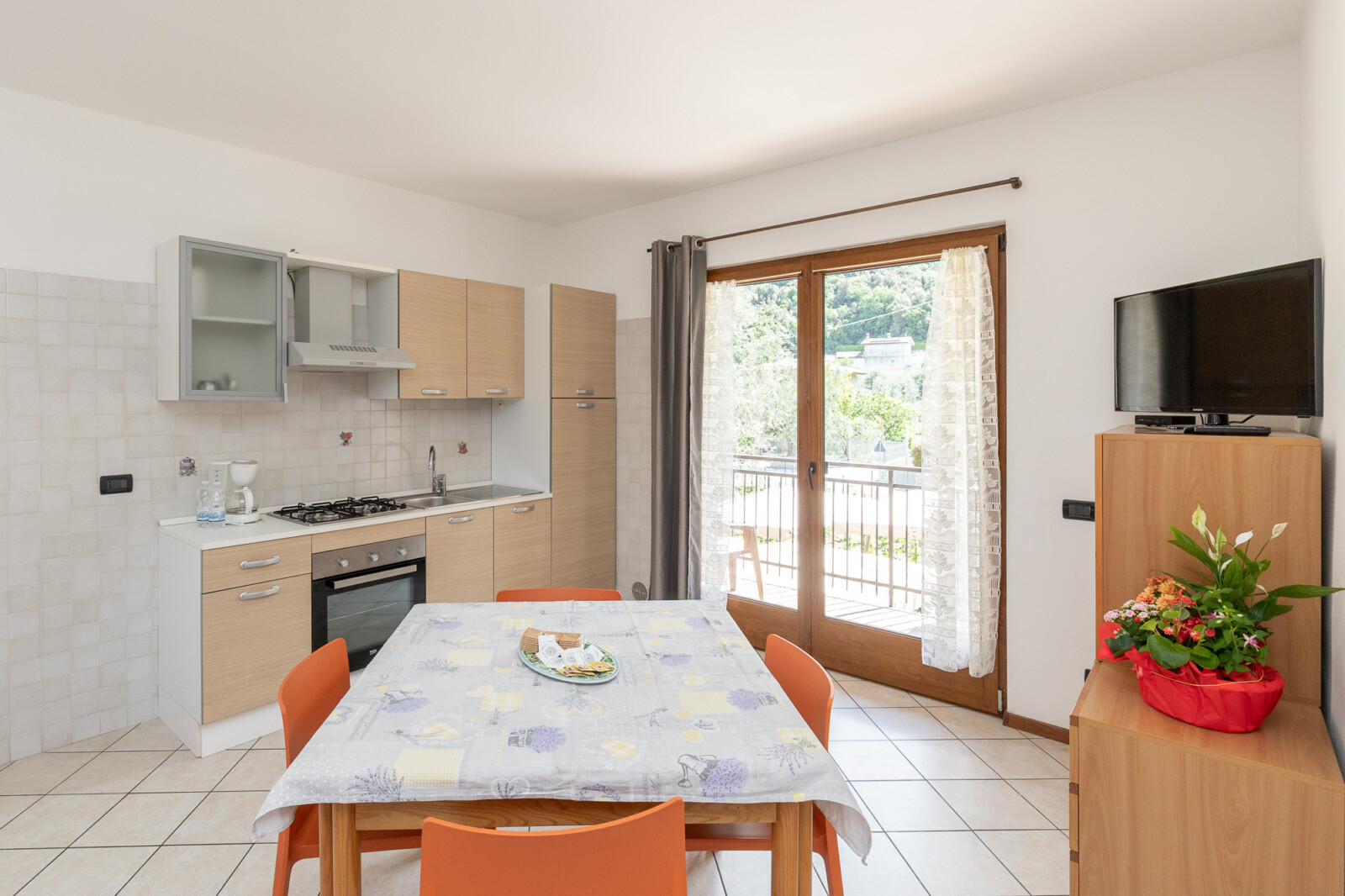 Nella zona giorno, oltre al blocco cucina attrezzato, al tavolo con sedie c’è anche un allegro divano rosso, che può diventare anche un posto letto.